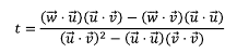 윗 식에서 아래 식을 빼 s를 소거하고 t만 남긴다. 식을 풀어 t에 대해 정리를 하면 다음과 같은 식이 만들어진다.