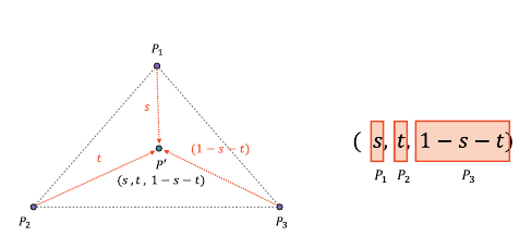 이전 세 점의 아핀결합에서 사용된 세 스칼라 (s, t, 1 - s - t)는 모두 실수이므로, 이들을 묶어서 하나의 3차원 벡터를 생성할 수 있다. 이렇게 아핀 결합의 스칼라를 묶어 만든 좌표를 무게중심좌표 ( Barycentric Coordinate ) 라고한다.