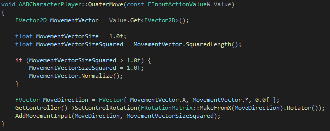 우리의 FInputActionValeu& Value 매개변수는 (1, 0), (-1, 0), (0, 1), (0, -1) 의 형태로만 넘어온다. (위의 Modifier)