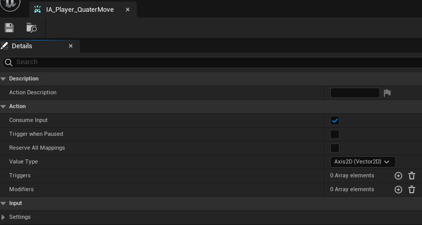 InputAction을 설정한다. 이 곳에서는 Trigger나 Modifier (위에서 설명했던 입력값 변조와 이벤트 활성화) 를 설정할 수 있으며, 넘어오는 값이 무엇인지를 Value Type으로 설정할 수 있다.