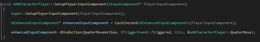 현재 기본으로 설정되어있는 입력 컴포넌트를 UEnhancedInputComponent로 캐스팅 한 후, 생성자에서 불러온 Action을 바인딩한다.
