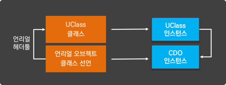 컴파일 단계에서 언리얼 오브젝트마다 UClass가 생성된다면, 실행 초기의 런타임 과정에서 언리얼 오브젝트마다 클래스 정보와 함께 언리얼 오브젝트의 인스턴스가 생성된다. 이 특별한 인스턴스는 언리얼 오브젝트의 기본 세팅을 지정하는데 사용되는데, 이를 클래스 기본 객체 ( Class Default Object ) 라고 한다.