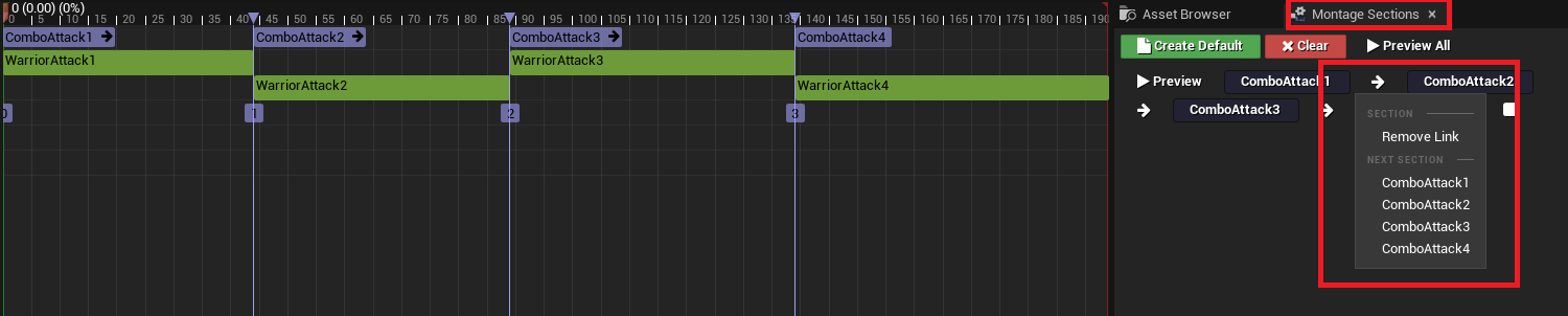 ComboAttack1 에서 ComboAttack4로 가려면 Next Section을 ComboAttack4로 설정해주기만 하면 된다.