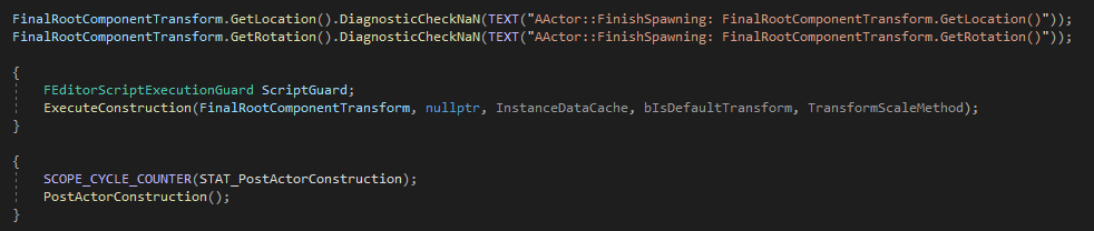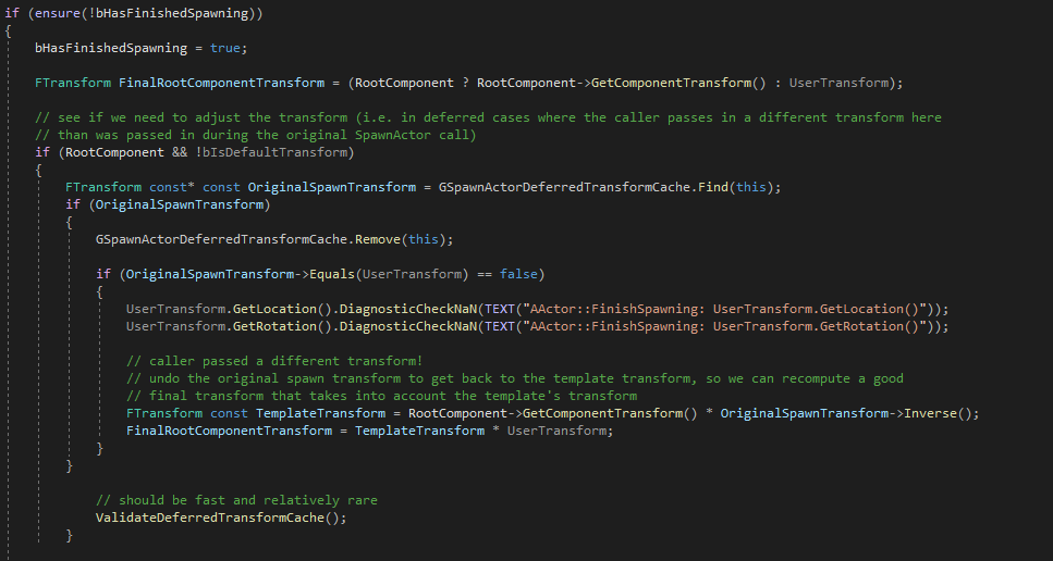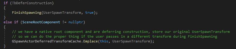 FinishSpawning은 작업은 상대적으로 간단하며, 액터의 Deferred Construct을 조정한다.