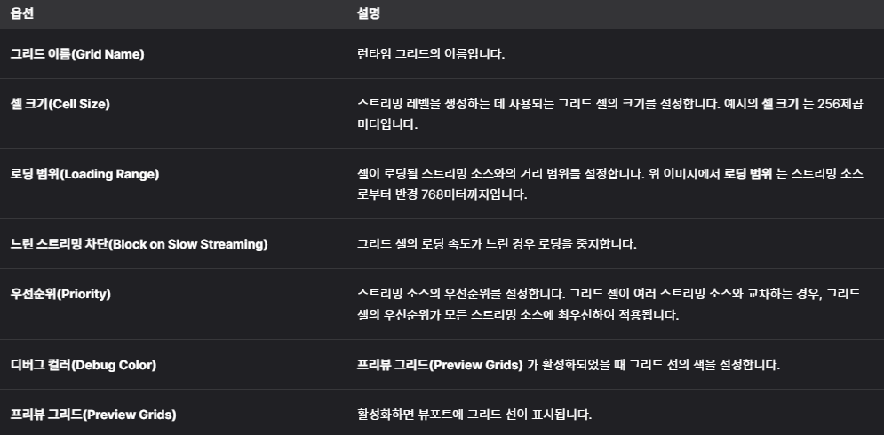 여기선 그리드에 대한 다양한 데이터 설정과 HLOD Data layer 등을 설정할 수 있는데.