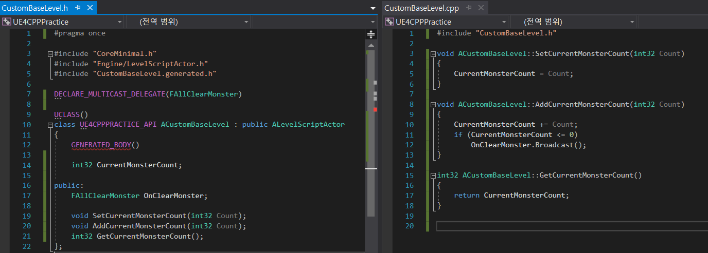 | 언리얼엔진4로 작업을 하다보면, Level 에 있는 Actor 간 통신을 하기에 중개자가 있으면 좋을 것 같단 생각을 한다. 이를 위해 다양한 방법을 사용하는데 우리는 Level을 사용할 것이다. ( 우리가 DirectX나 또는 소프트웨어 렌더러를 사용한다면 Scene 또는 Manager 정도로 생각하면 될 것 같다. ) Level을 C++로 작성하여 Custom 함수도 추가하고, Actor 간의 통신을 유연하게 할 예정이다. 작성할 내용은, 각 Scene에 있는 몬스터들을 추가한 후 Level에게 알려주고 몬스터가 다 죽는 이벤트가 발생할 시에 Level 의 Delegate로 모두에게 BroadCasting 하는 방법으로 작성할 예정이다. |
