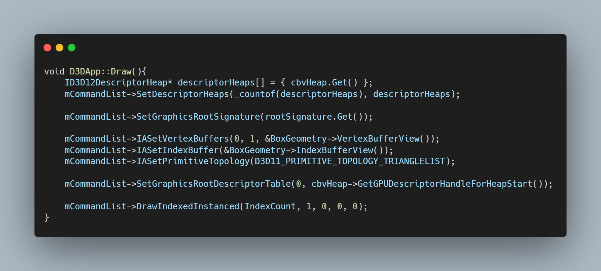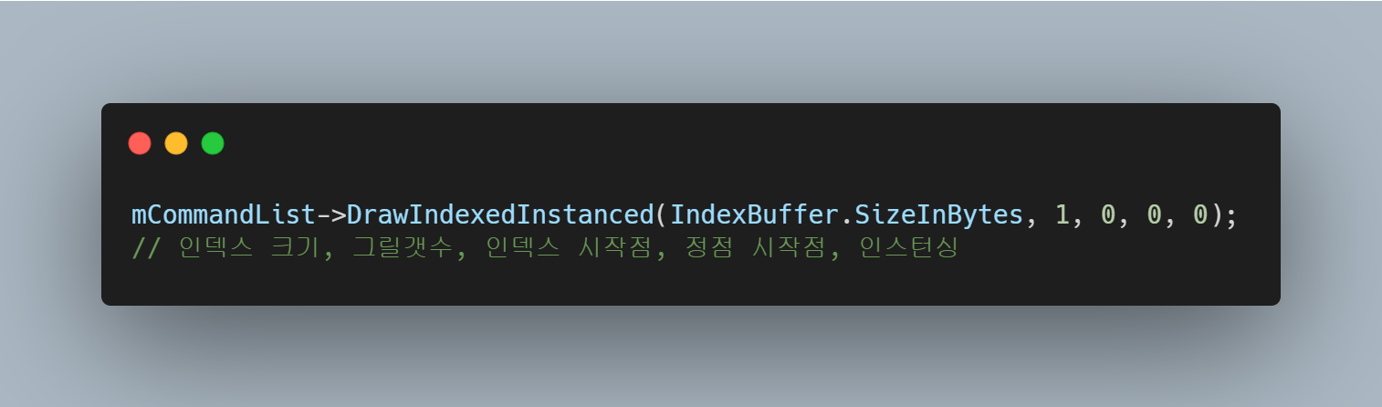 마지막으로 Index 를 이용하여 도형을 그리려면 DrawIndexedInstanced 함수를 사용해야 한다.