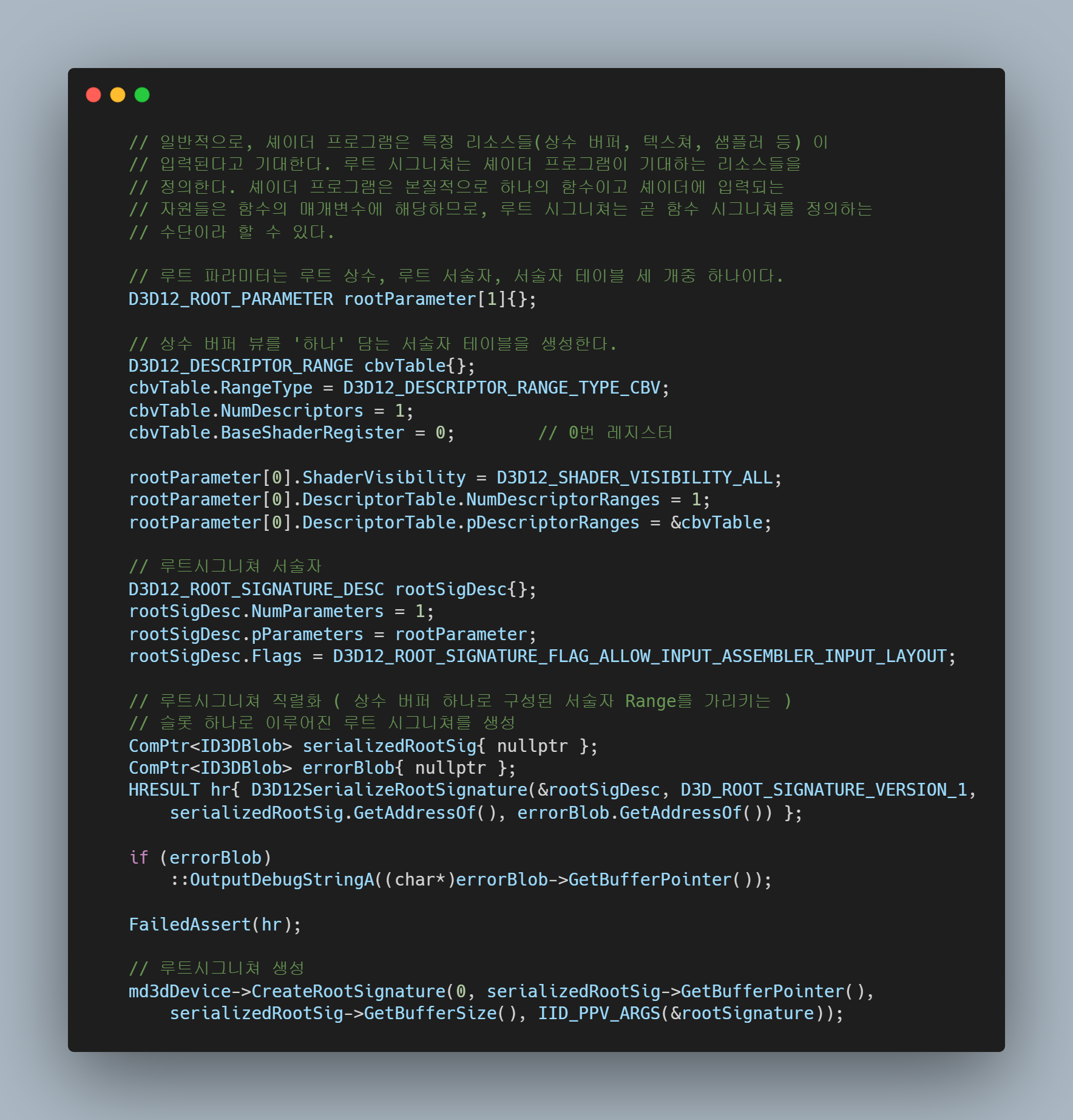 이제 Root Parameter를 통해 Root Signature를 생성했으면, 생성된 모든 것을 CommandList에 등록 하면 된다.