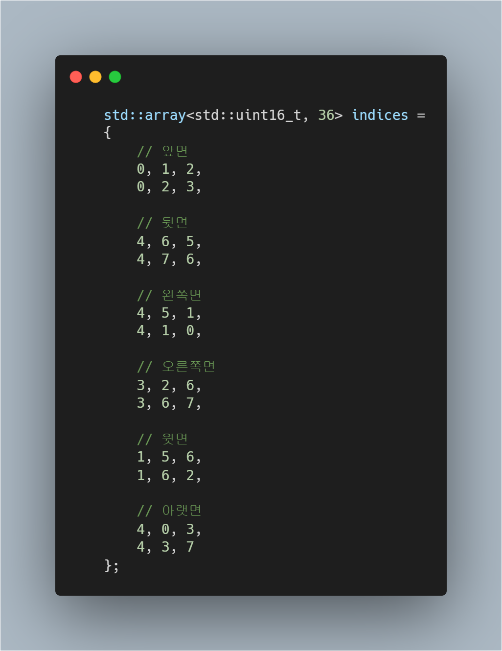 작성한 Vertex를 기준으로 Index 를 구축한다.