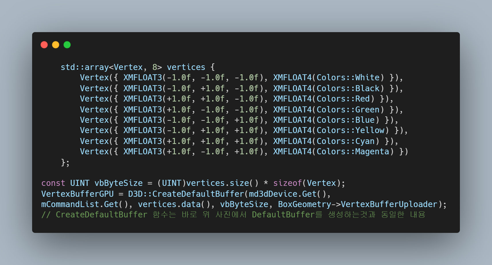 GPU가 Vertex들의 배열에 접근하려면, 그 Vertex들을 Buffer라고 하는 GPU 자원 (ID3D12Resource)에 넣어두어야 한다.