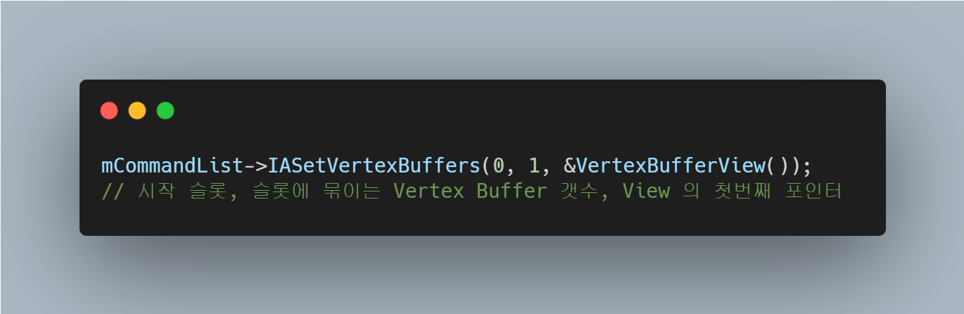 실제로 Vertex Buffer를 Pipeline State Object에 Binding 할땐 IASetVertexBuffers를 사용한다.