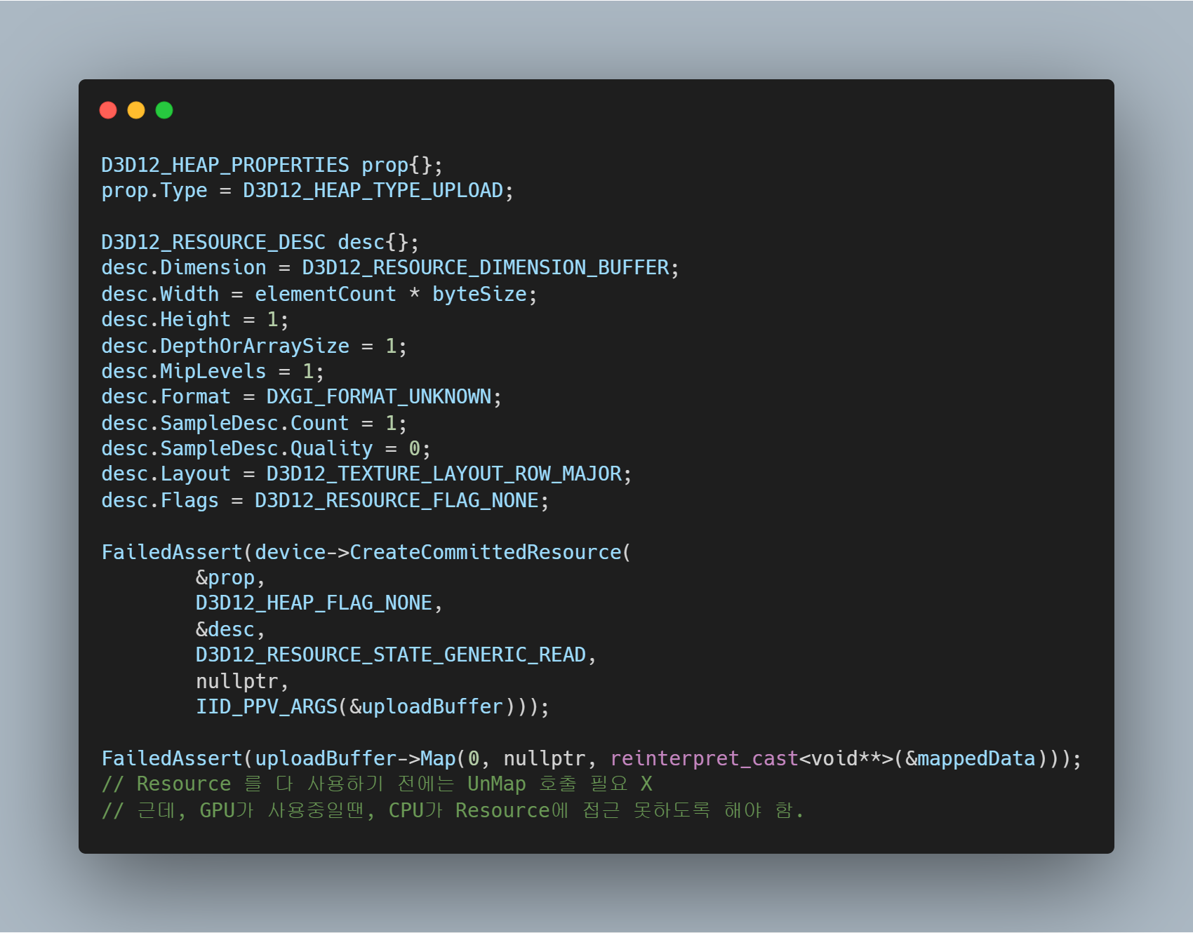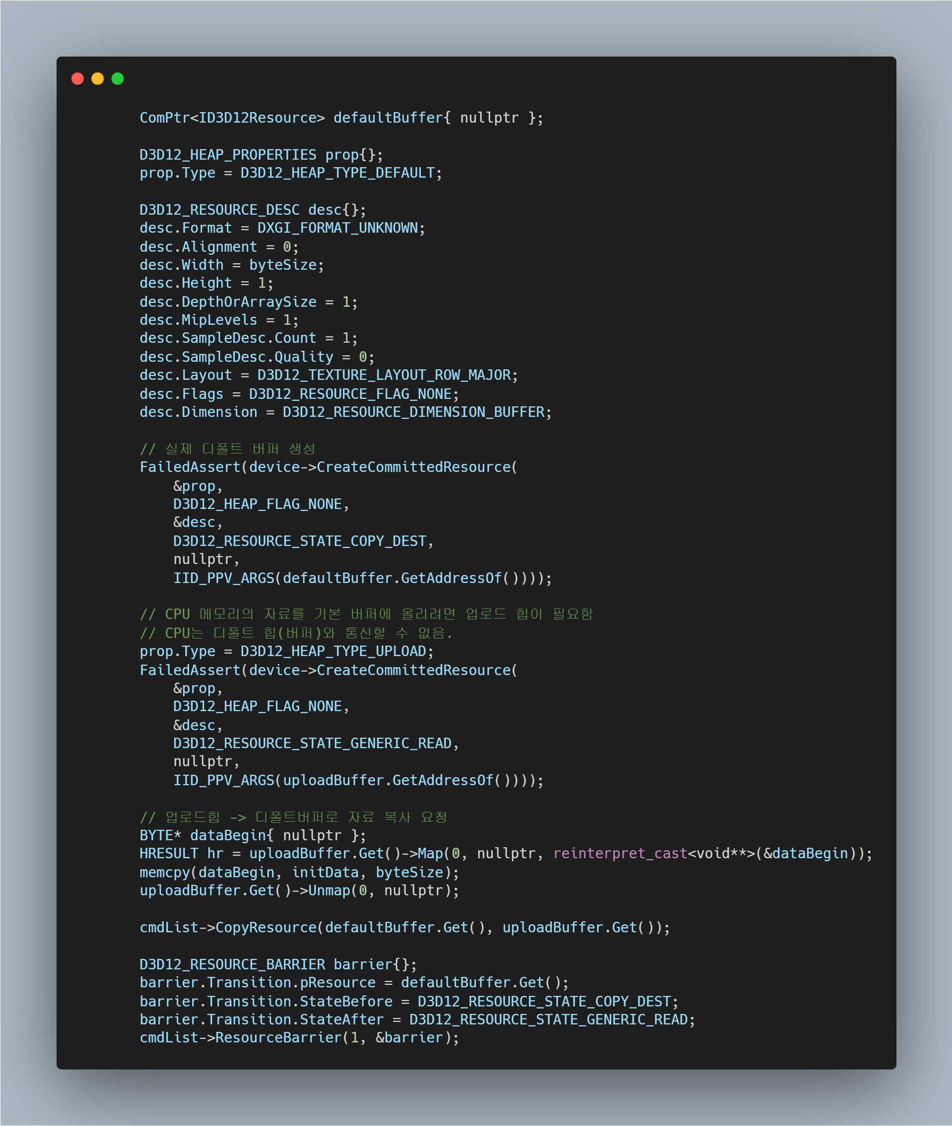 이제 UploadBuffer를 생성하는 함수를 하나 작성한다. 아래와 같다.