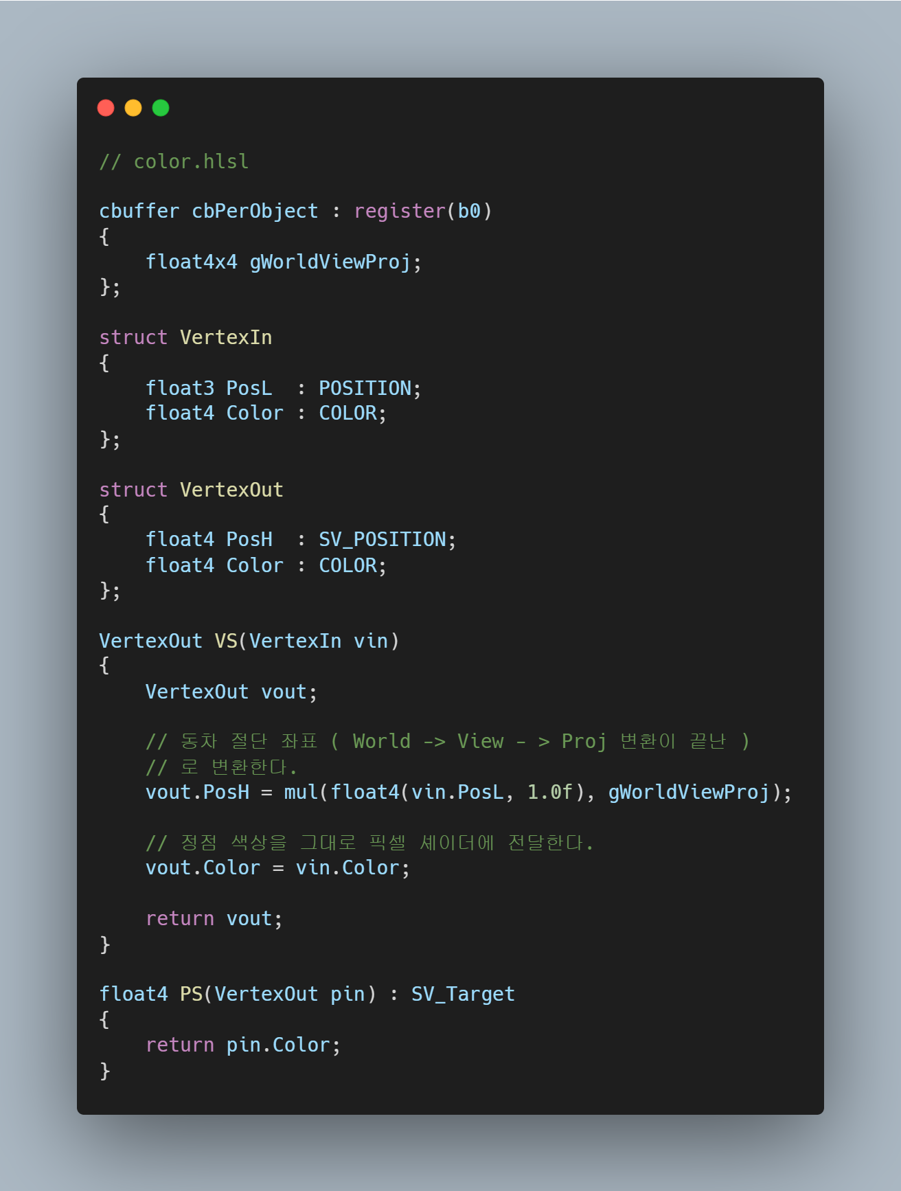 gWorldViewProj 은 상수 버퍼이므로, 다음 내용에서 다시 언급한다.