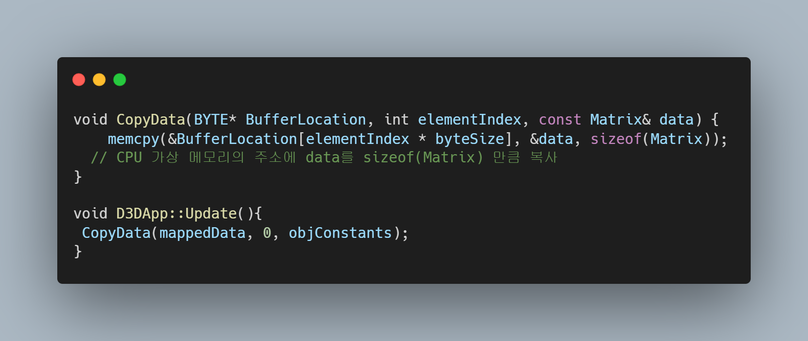 UploadBuffer에 접근할 수 있는 CPU 주소를 넘겨준다. 이를 통해 매 프레임마다 값을 집어넣는다.