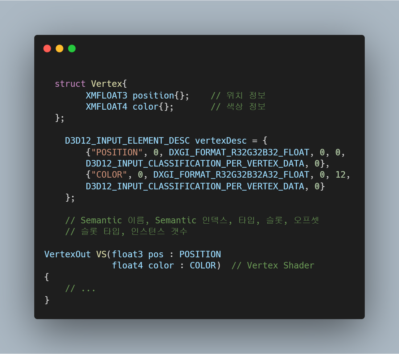 잘보면 POSITON 과 COLOR Semantic 은 Vertex Shader 에서 각 인자와 매칭됨을 알 수 있다. 매칭되지 않을 시 오류