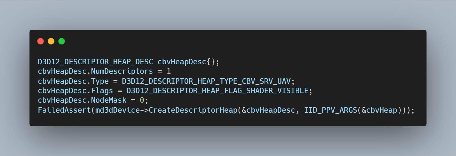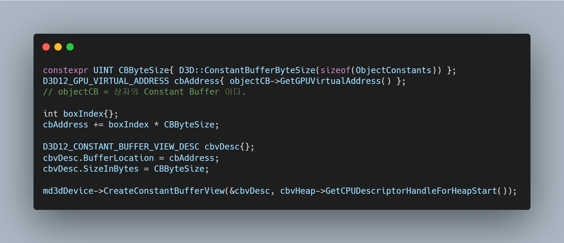 이제 Constant Buffer View 를 생성해야한다. 이미 5번에서 생성해둔 Descriptor Heap이 있으므로 그것을 이용한다.