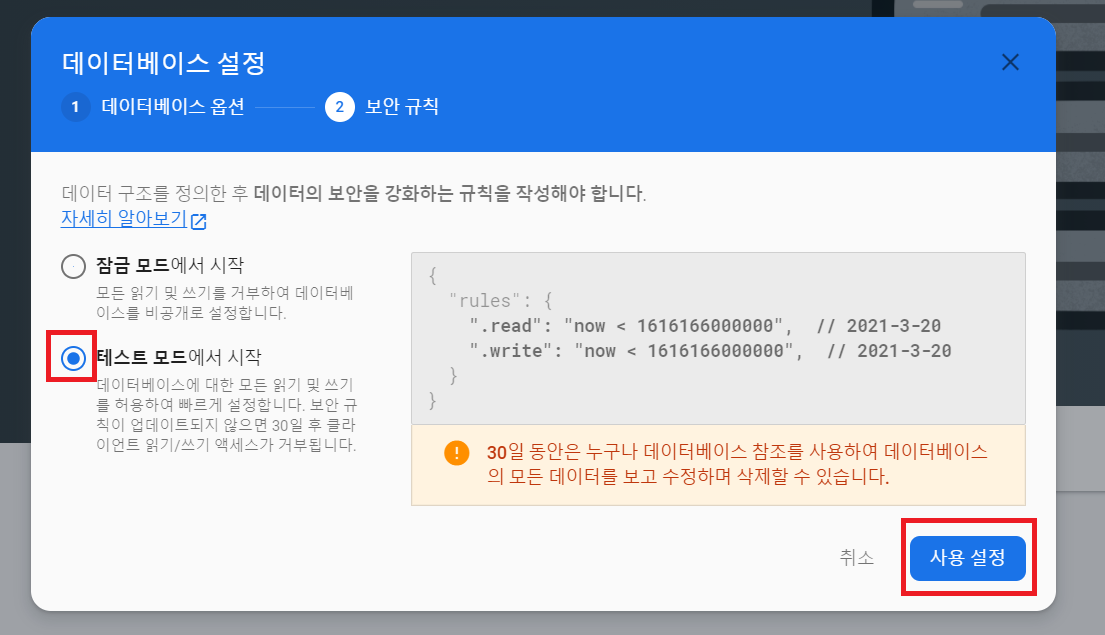 4-2) 보안 규칙이 필요합니다. 나중에 모드를 변경할 수 있으니, 우리는 일단 연동을 위해 '테스트 모드'를 선택합니다.
