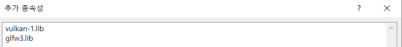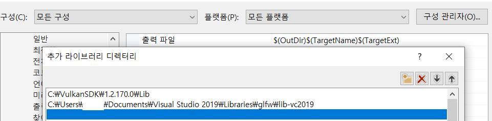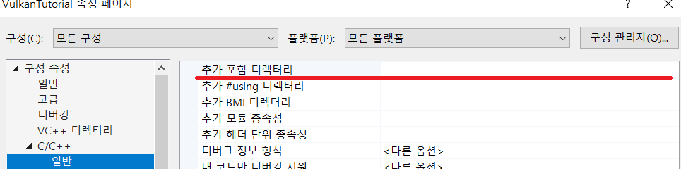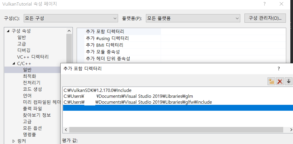 자신이 설치한 Vulkan, GLFW, GLM 헤더 디렉토리를 추가합니다.