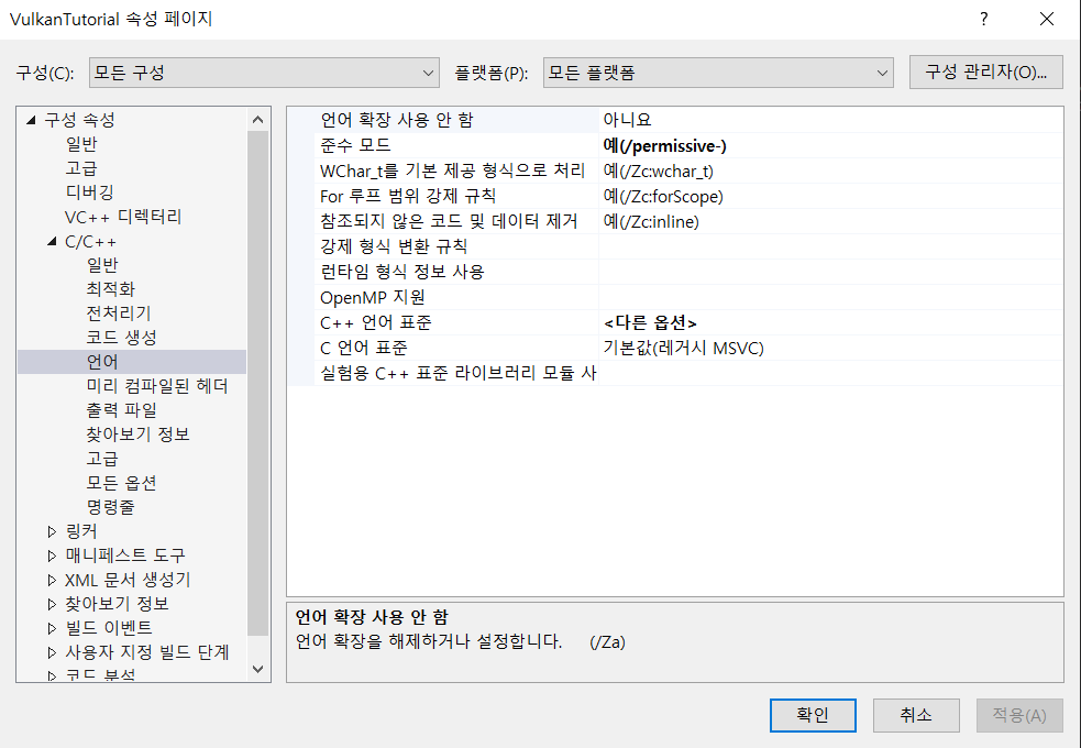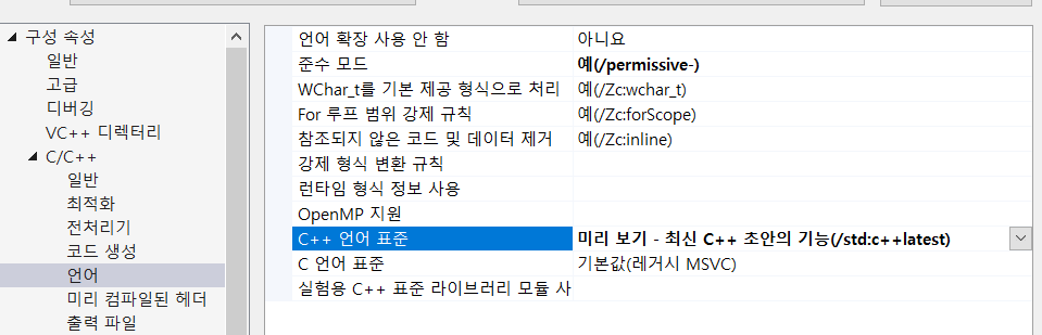 작성자같은 경우 C++20의 기능도 사용할 것 이므로 C++latest로 사용합니다.