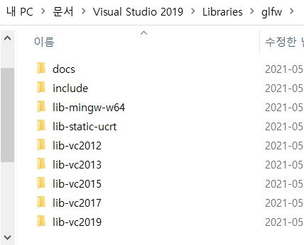 저는 편하게 내 문서\Visual Studio 2019\Libraries\glfw 에 압축을 풀겠습니다.