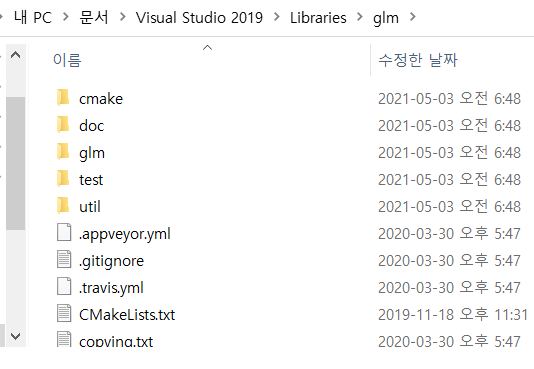 저는 편하게 내 문서\Visual Studio 2019\Libraries\glm 에 압축을 풀겠습니다.