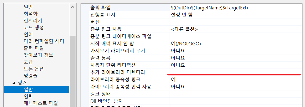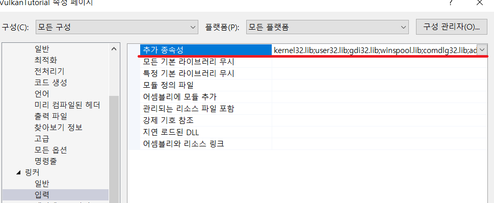 다음으로 링커 -> 일반에서 Vulkan, GLFW 라이브러리를 추가합니다.