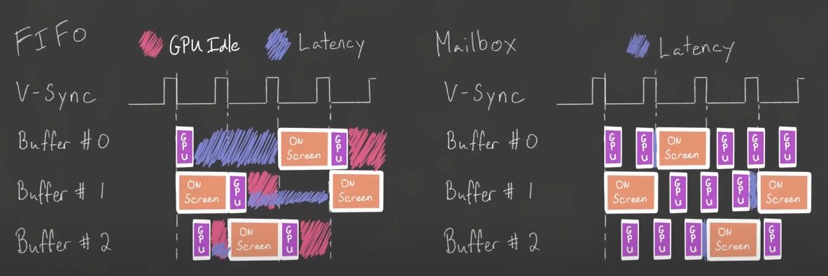 일반적인 법칙으로, V-Sync를 활성화하고 싶으면 FIFO를 선택하고 가장 빨리 실행하고 싶으면 IMMEDIATE나 MAILBOX를 선택한다. IMMEDIATE는 티어링을 생성하지만, 가장 낮은 Latency를 제공한다.