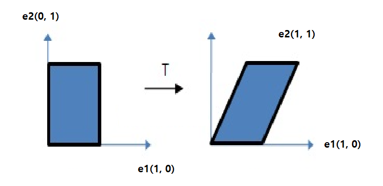 표준 기저 벡터 e1, e2가 있을 때 e2를 x축 방향으로 미는 변환을 생각해보자
