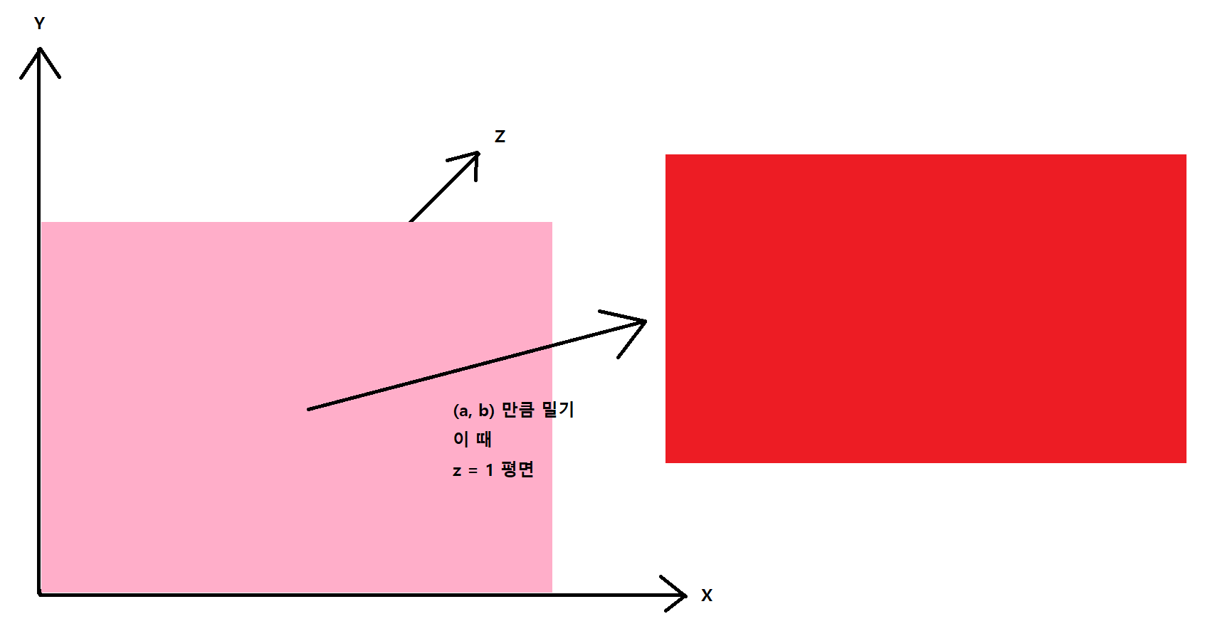 이렇게 3차원인 공간에서 x축과 y축을 (a, b) 만큼 밀었을때 z는 1인 평면상에서 이동한 결과를 가지게 된다.